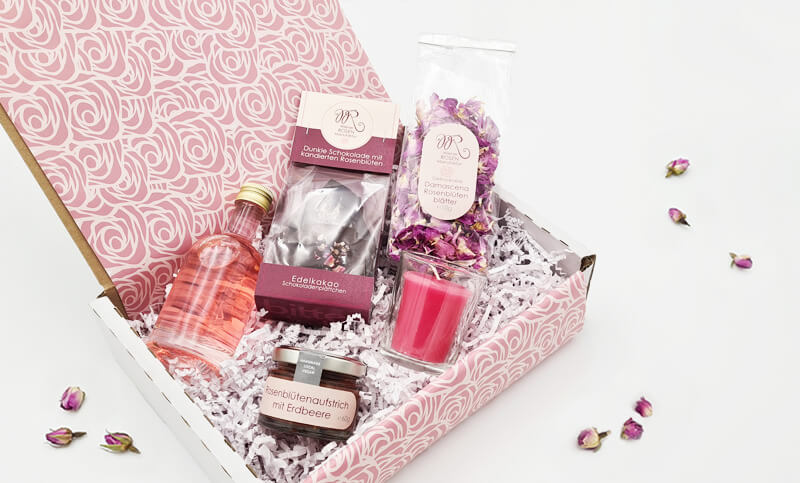 Vom Rosenblütenaufstrich mit Erdbeer-Aroma bis zu den romantischen Duftkerzen, von der süßen Versuchung unserer Schokolade bis zum Rosengin, um sich einmal kurz etwas fallen zu lassen – Die sorgfältig ausgesuchten Produkte der Rosenmanufaktur, sollen den schönsten Gefühlen gestiftet sein und diese höchsten Gefühle vermitteln. Jetzt Geschenkbox Liebe kaufen.